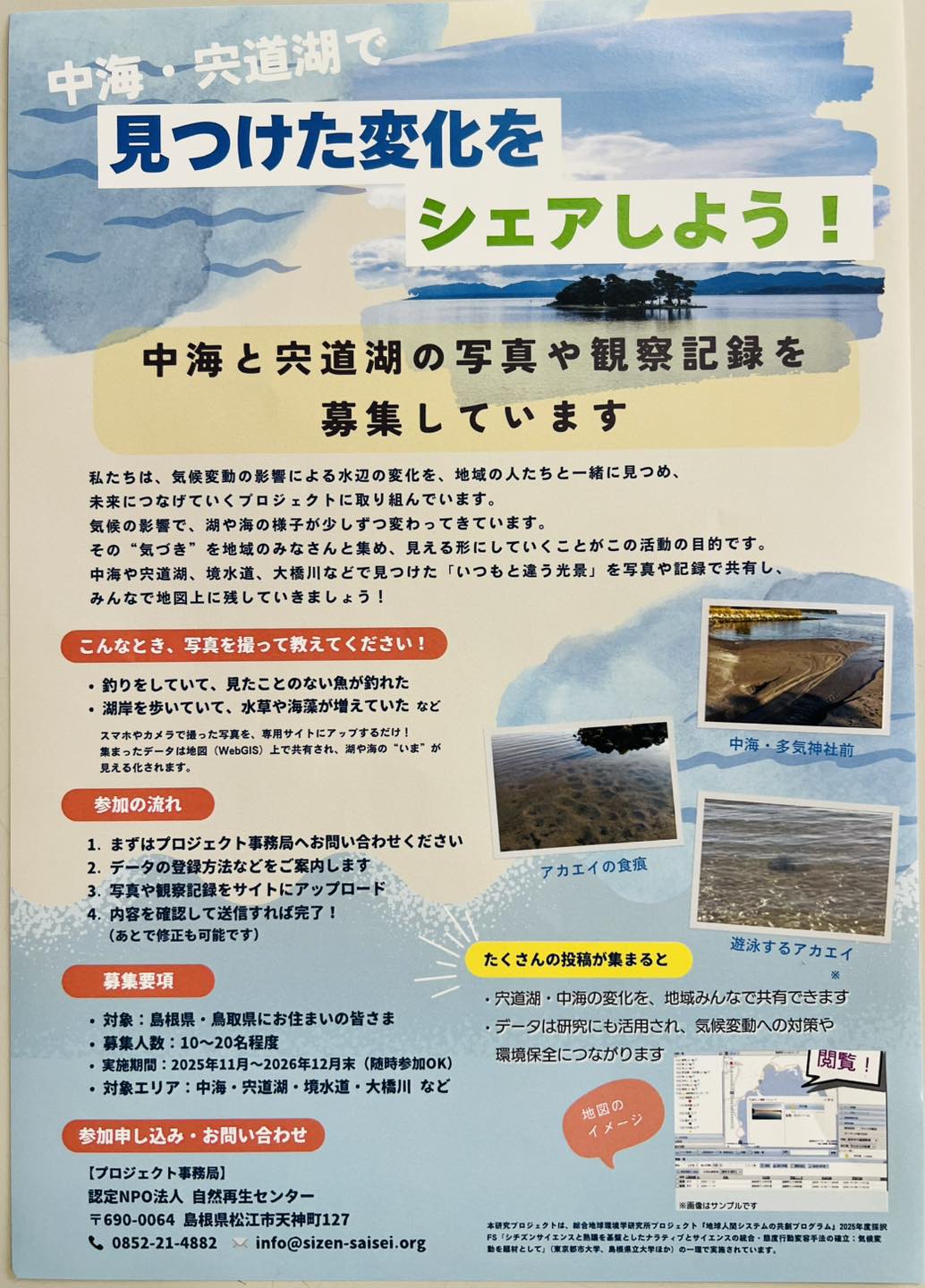 私たちは、気候変動の影響による水辺の変化を地域の人たちと一緒に見つめ、 未来につなげていくプロジェクトに取り組んでいます。 気候の影響で、湖や海の様子が少しずつ変わってきています。 その“気づき”を地域のみなさんと集め、見える形にしていくことがこの活動の目的です。 中海や宍道湖、境水道、大橋川などで見つけた「いつもと違う光景」を写真や記録で共有し、 みんなで地図上に残していきましょう!