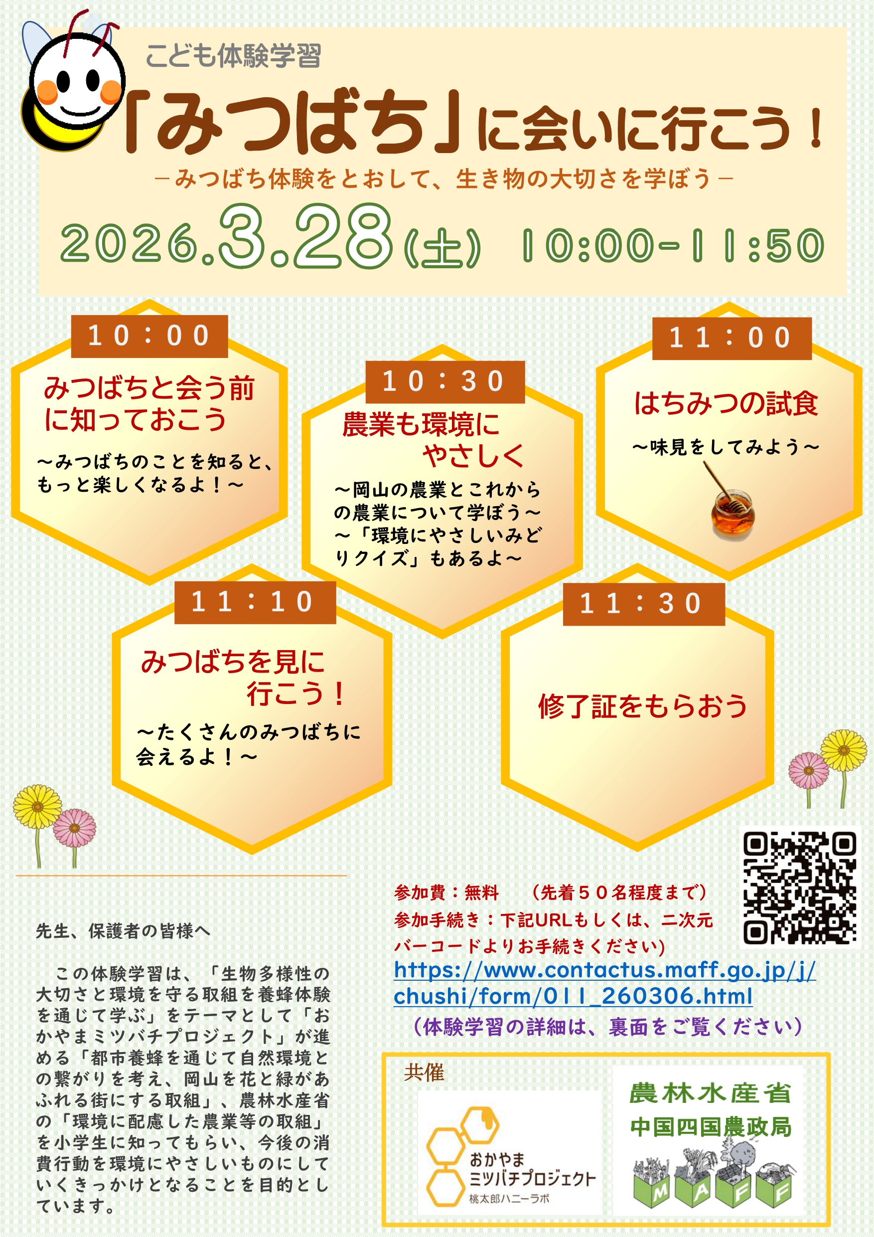 都市養蜂「おかやまミツバチプロジェクト」の取り組みを聞き、みつばちの生態を観察してみましょう。おかやまミツバチプロジェクトで採れたハチミツの試食もあります。