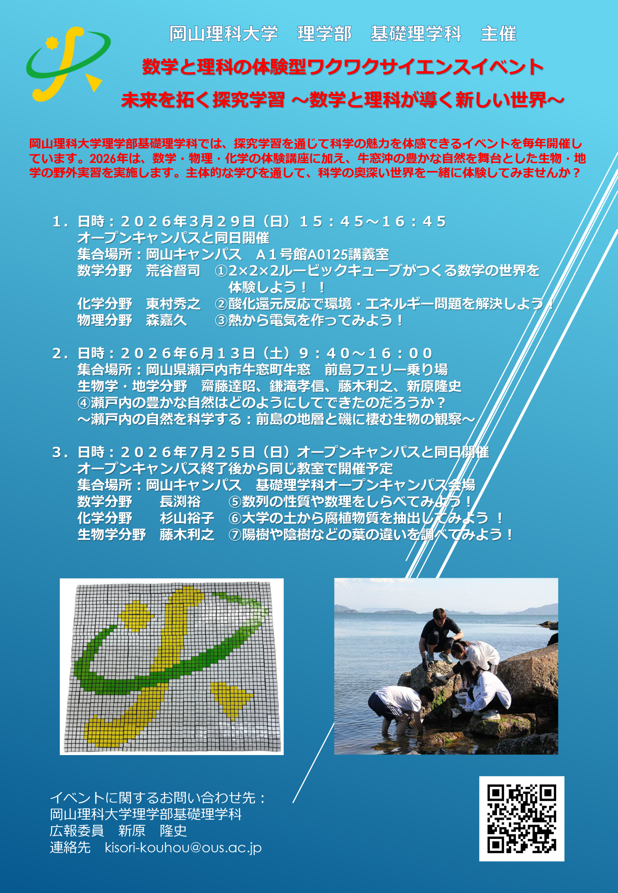 2026年は、数学・物理・化学・生物の体験講座に加え、牛窓沖の豊かな自然を舞台とした生物・地学の野外実習も実施します。