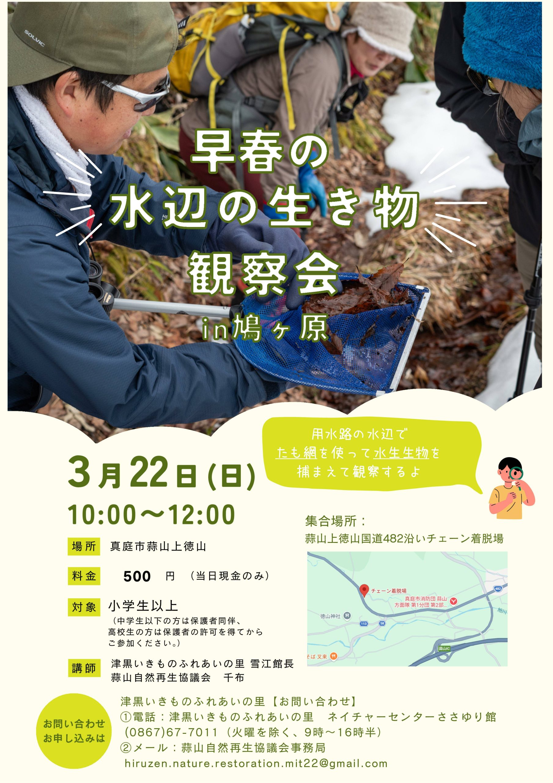 *プログラムの内容上、水たまりや浅い小川で作業しますので、濡れることがあります。着替えのご用意があると、濡れても着替えられるのでなお良いと思います。